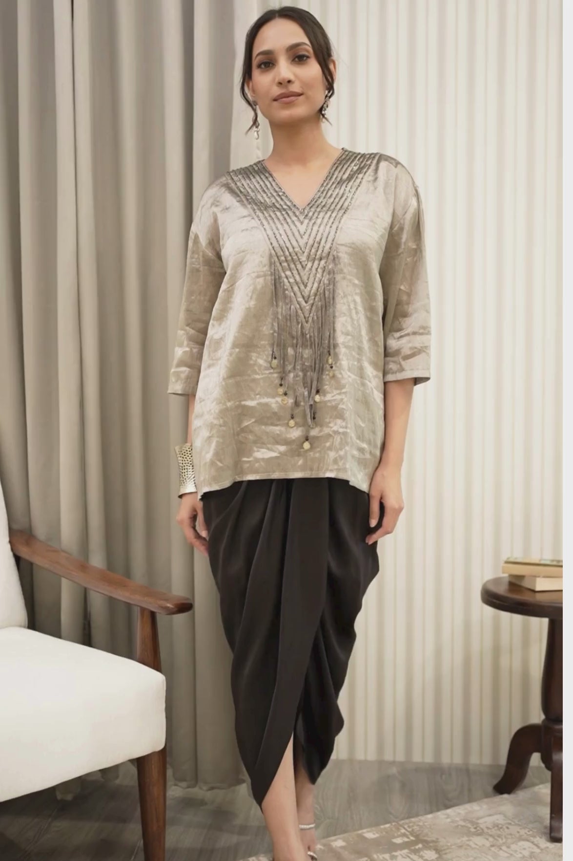 Embroidered Pure Silk Top with Draping Skirt- Silver